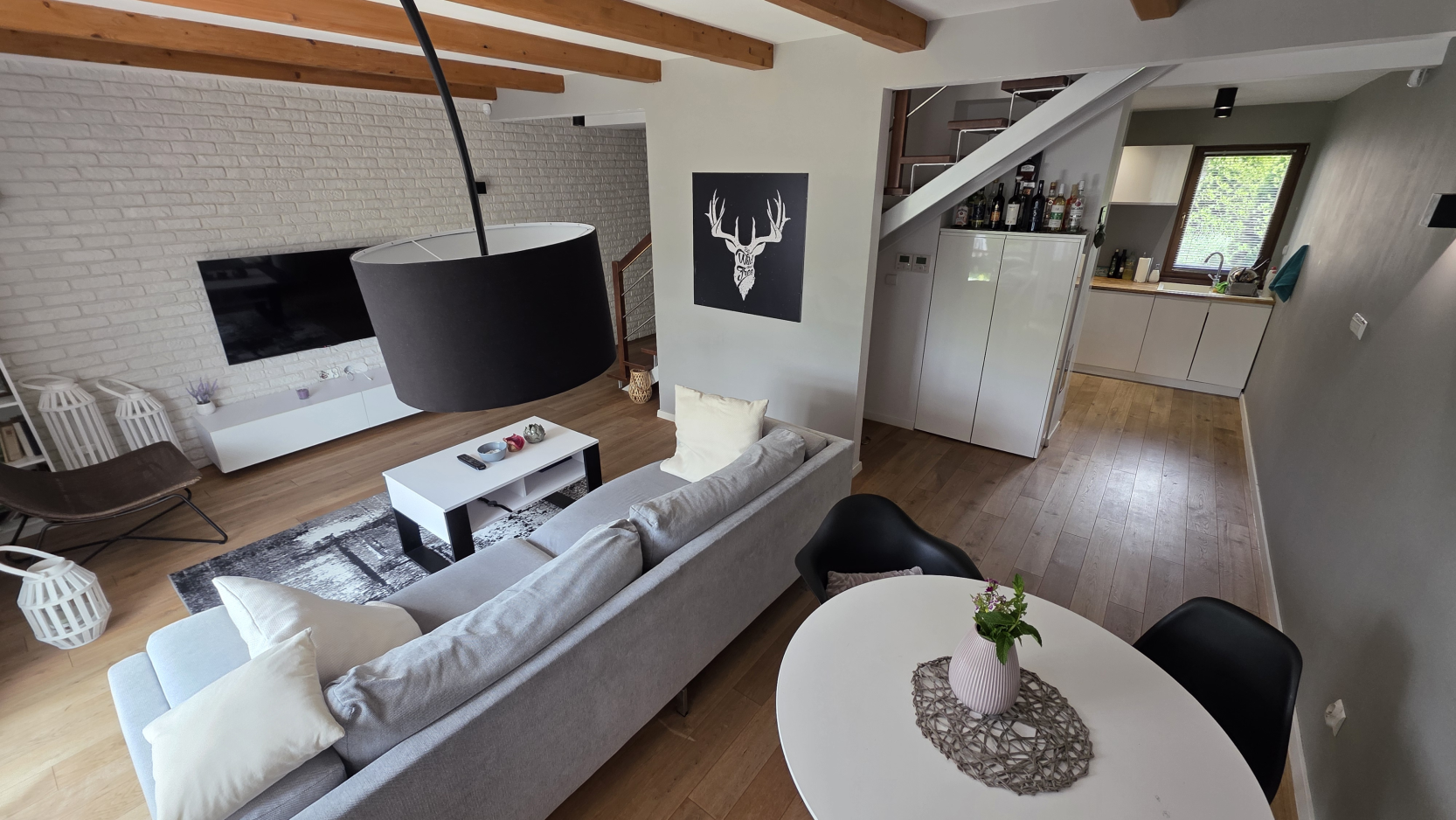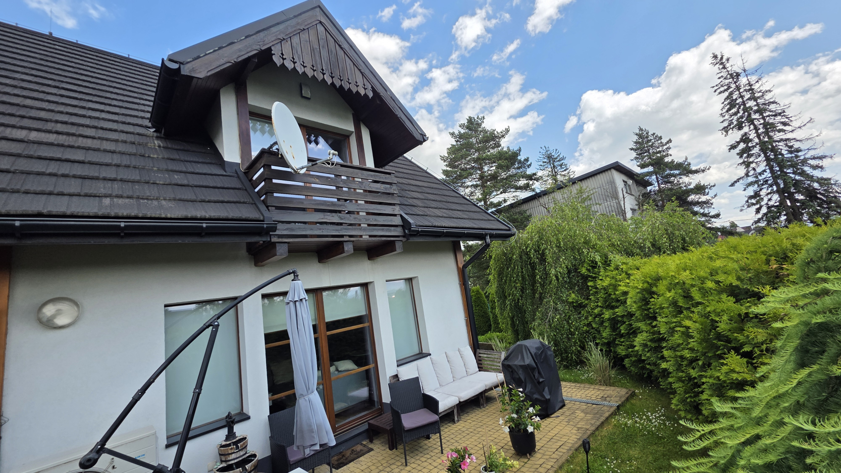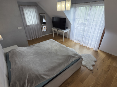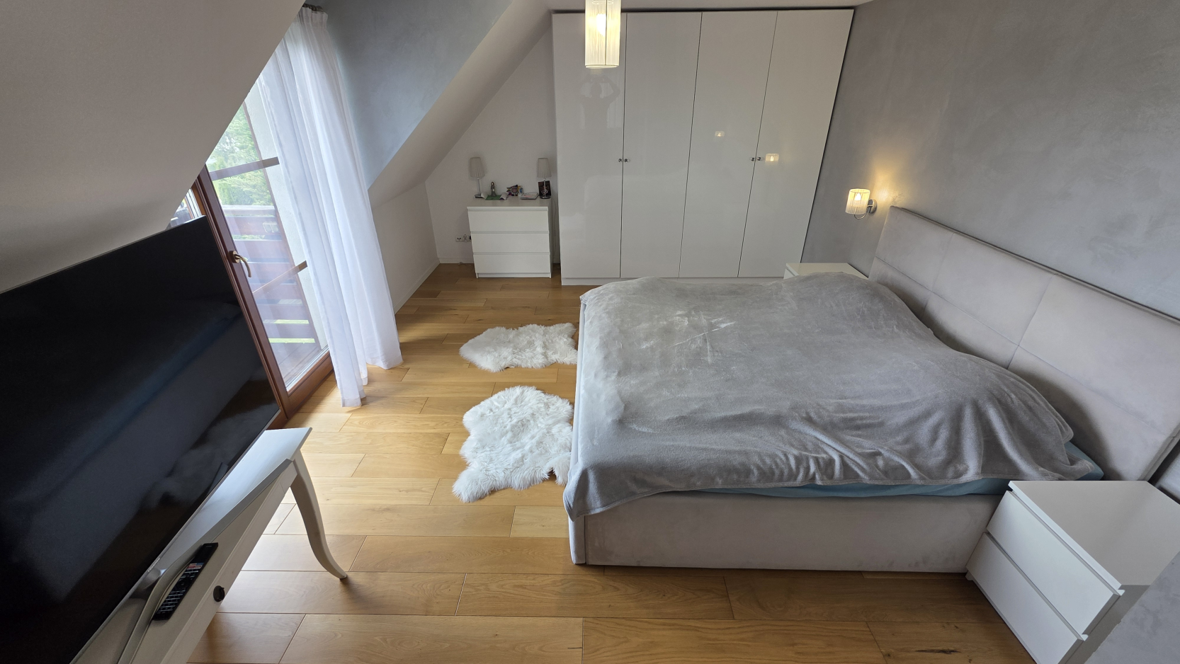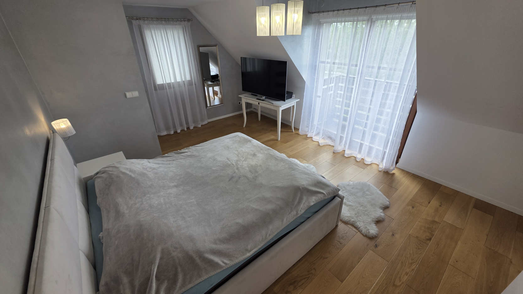 Po wejściu do środka i przejściu przez wiatrołap znajdujemy się w strefie dziennej. Podzielona została na przestronny salon z jadalnią oraz kuchnię. Z salonu prowadzi wyjście na ogród. Na parterze znajduje się również nowoczesna łazienka. Na piętrze znajduje się strefa prywatna zagospodarowana dwoma sypialniami. Jeden pokój posiada balkon ze spektakularnym widokiem na Tatry. Na poddaszu znajduje się też dodatkowe wykończone pomieszczenie z możliwością zagospodarowania wedle własnego uznania.