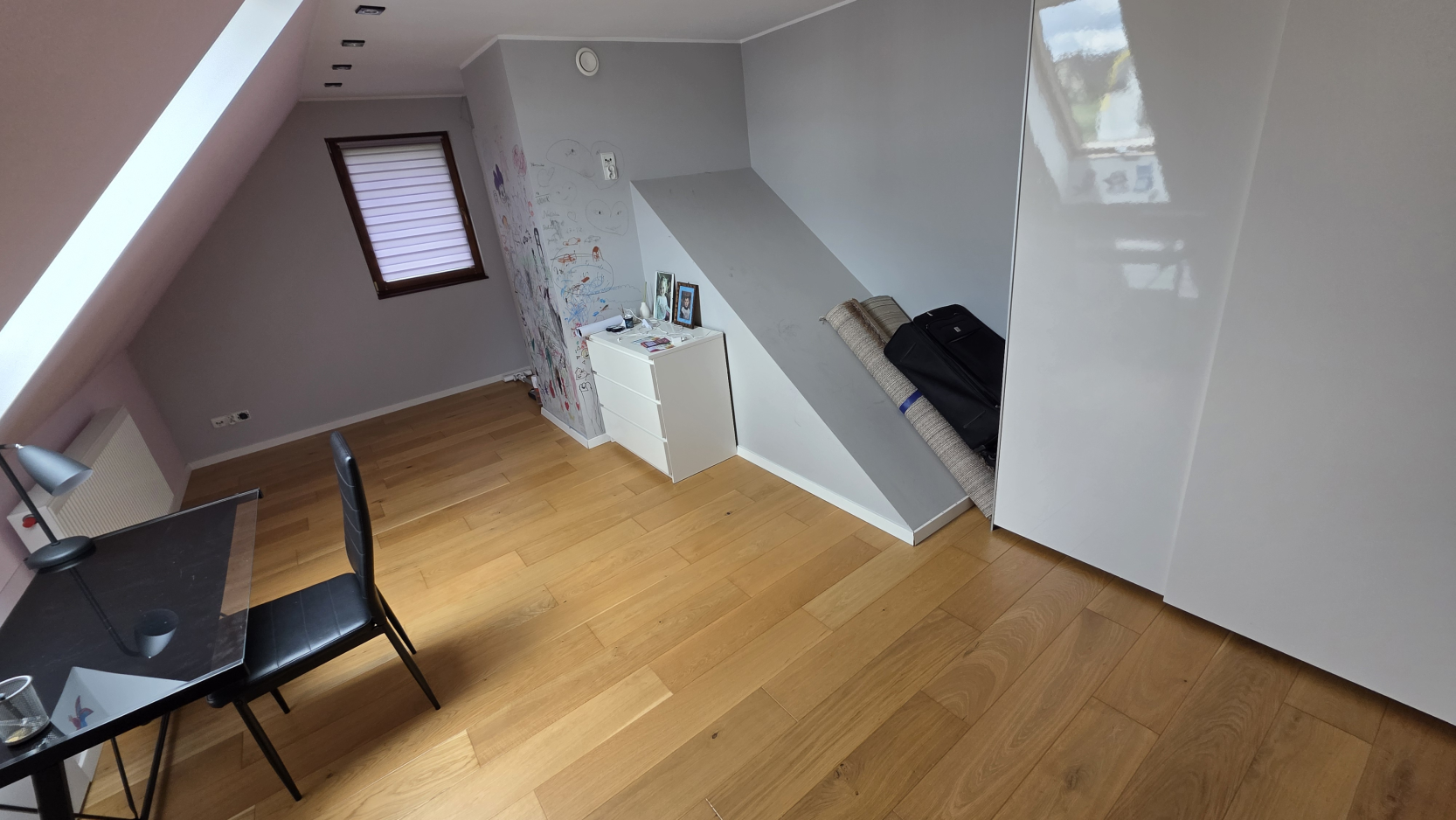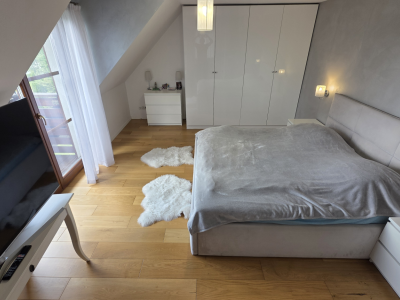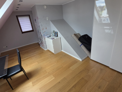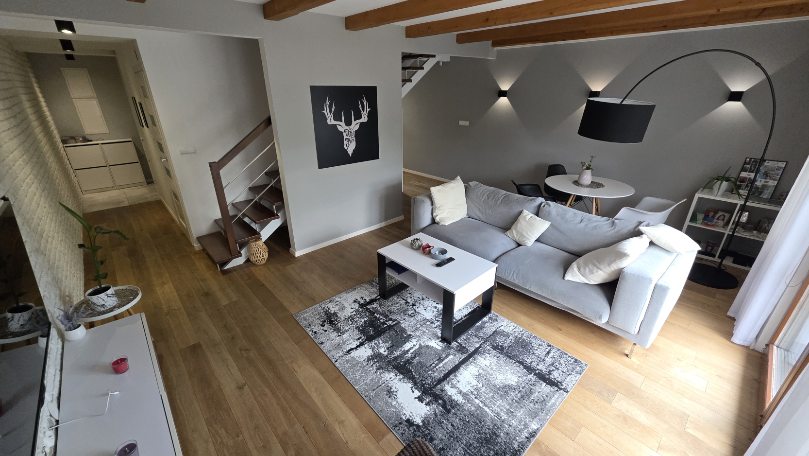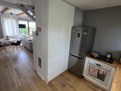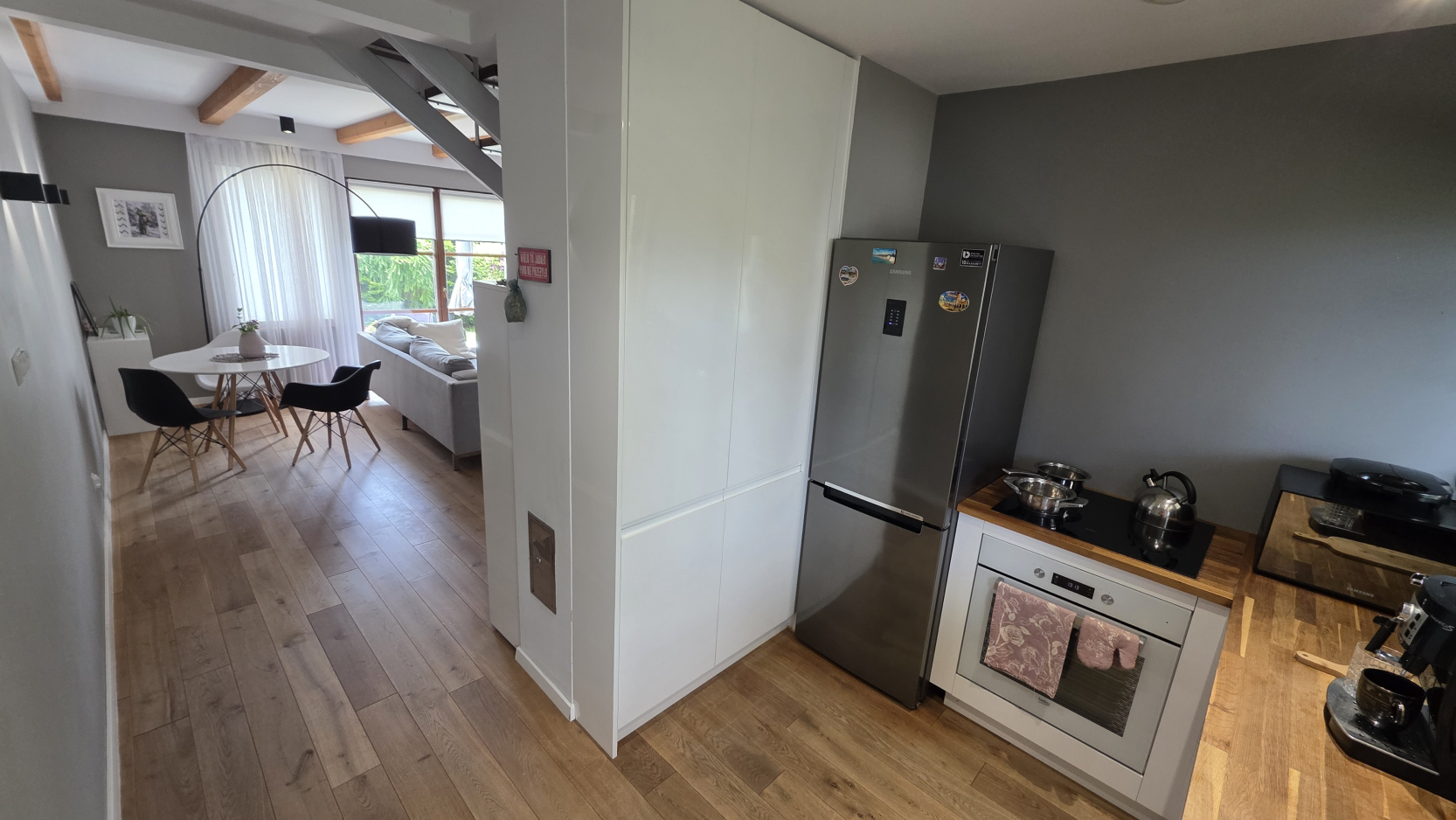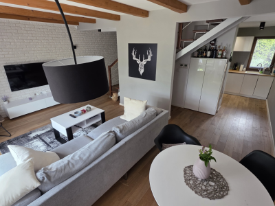 Po wejściu do środka i przejściu przez wiatrołap znajdujemy się w strefie dziennej. Podzielona została na przestronny salon z jadalnią oraz kuchnię. Z salonu prowadzi wyjście na ogród. Na parterze znajduje się również nowoczesna łazienka. Na piętrze znajduje się strefa prywatna zagospodarowana dwoma sypialniami. Jeden pokój posiada balkon ze spektakularnym widokiem na Tatry. Na poddaszu znajduje się też dodatkowe wykończone pomieszczenie z możliwością zagospodarowania wedle własnego uznania.