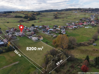Całość obejmuje działkę o powierzchni około 8200 m² (w tym około 6400 m² terenu budowlanego), dom mieszkalny o powierzchni około 200 m² oraz budynek gospodarczy o powierzchni około 200 m².
