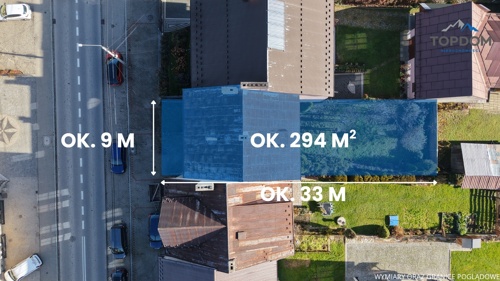 Działka: 294 m², wymiary ok. 33 m x 9 m