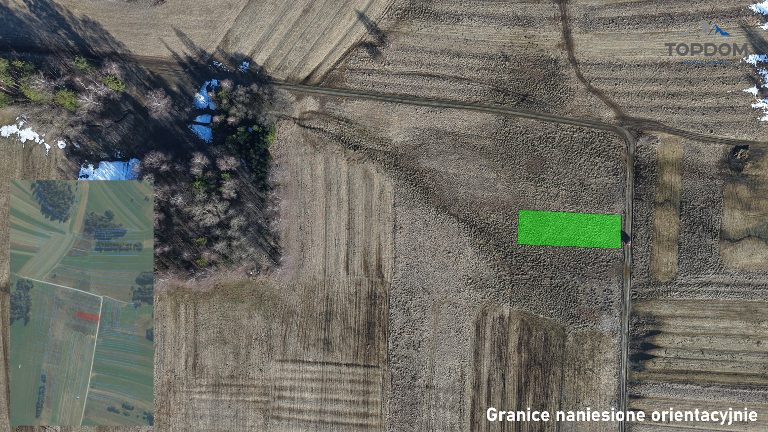 Działka ma powierzchnię 747 metrów kwadratowych. Jej szerokość wynosi około 13,5 metra, a długość około 55 metrów. Kształt działki jest regularny i wydłużony. Do działki prowadzi dobrze utwardzona droga polna.