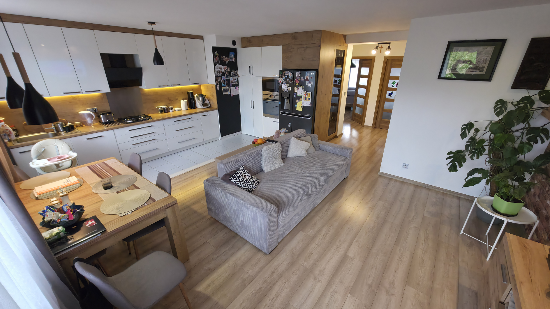 Mieszkanie o powierzchni 76.5 metrów kwadratowych. Zlokalizowane jest na drugim piętrze. Po przekroczeniu drzwi wejściowych znajdujemy się w przestrzennym przedpokoju. Po lewej stronie znajdują się dwa pokoje, na wprost łazienka, a kierując się na prawo, wchodzimy do dużej przestrzeni dziennej. Strefa zaprojektowana została jako dwie części tworzące spójną całość. Po lewej stronie znajduje się część będąca salonem z telewizorem i wygodną kanapą. W drugiej części znajduje się kuchnia w formie wygodnego aneksu oraz stół gdzie spożywane są wspólne posiłki.