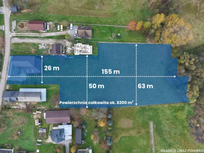 Całość obejmuje działkę o powierzchni około 8200 m² (w tym około 6400 m² terenu budowlanego), dom mieszkalny o powierzchni około 200 m² oraz budynek gospodarczy o powierzchni około 200 m².
