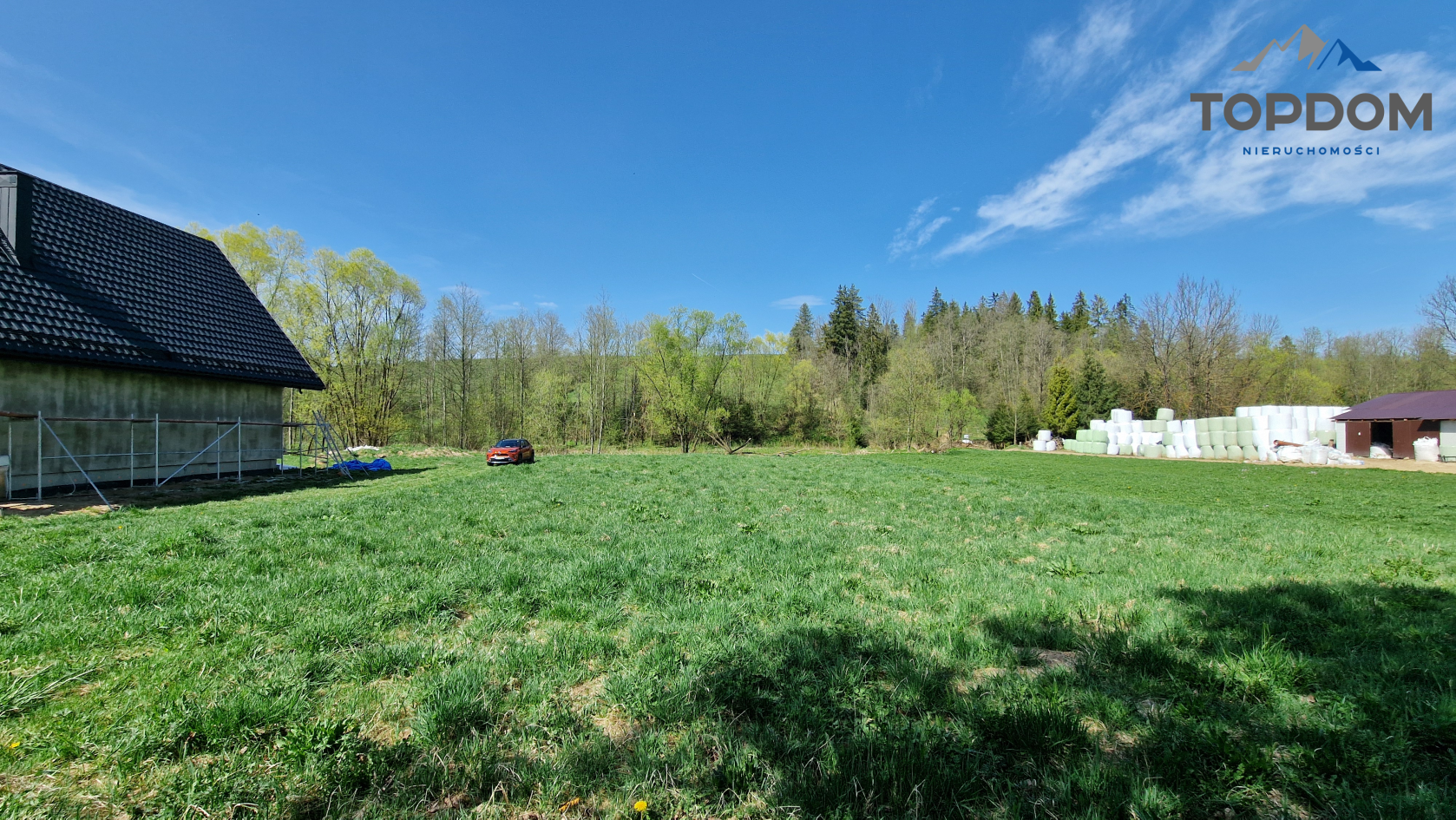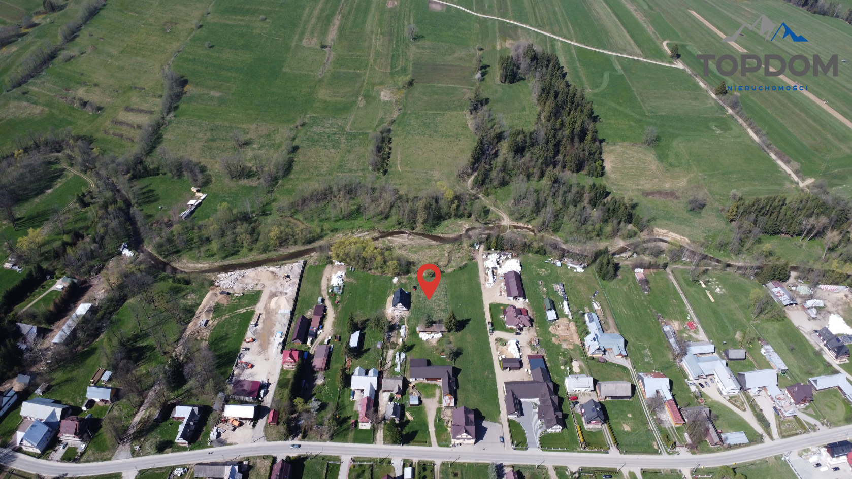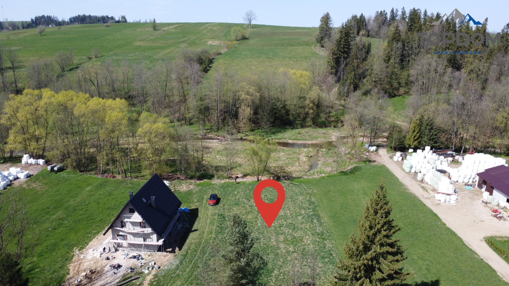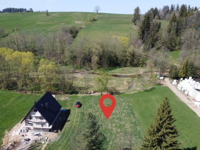 Działka ma powierzchnię około 2304 metrów kwadratowych, w tym 1257 metrów kwadratowych to teren budowlany. To znakomite proporcje, aby z przodu wybudować dom, a tył aż do potoku przeznaczyć na ogród i strefę zieloną.