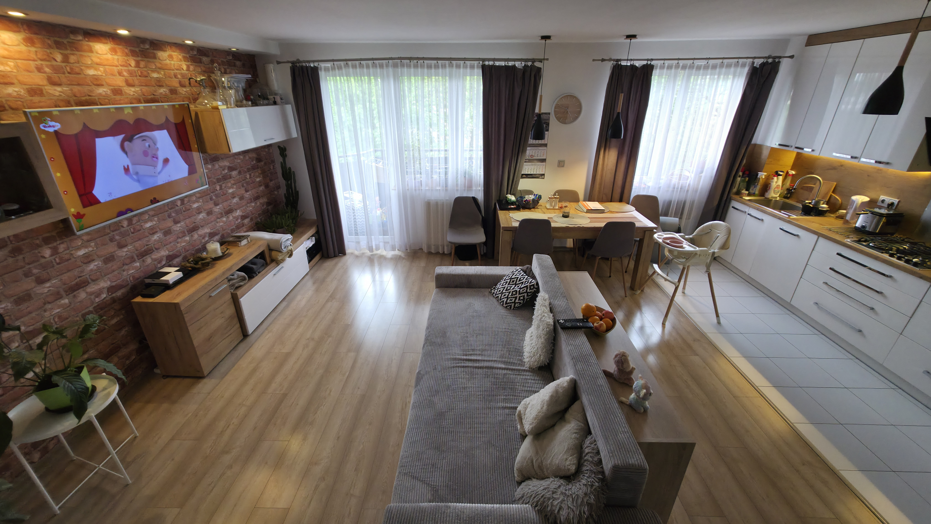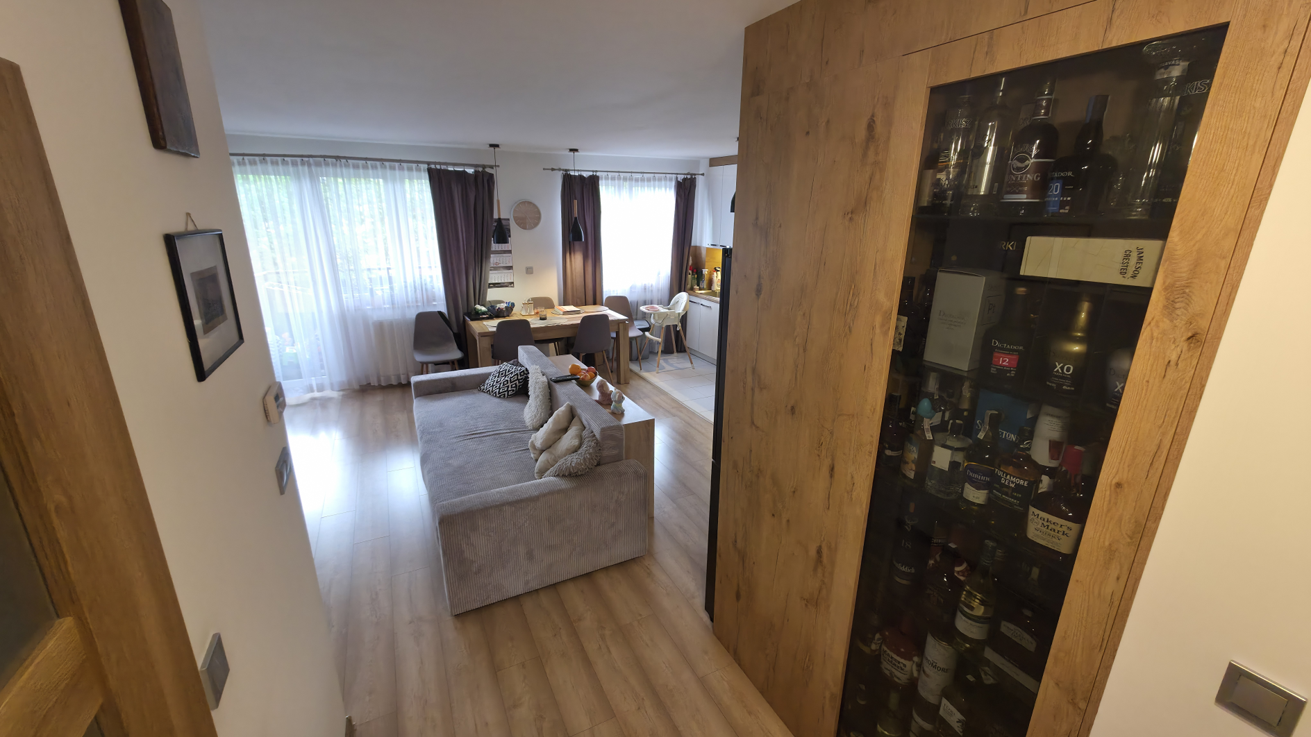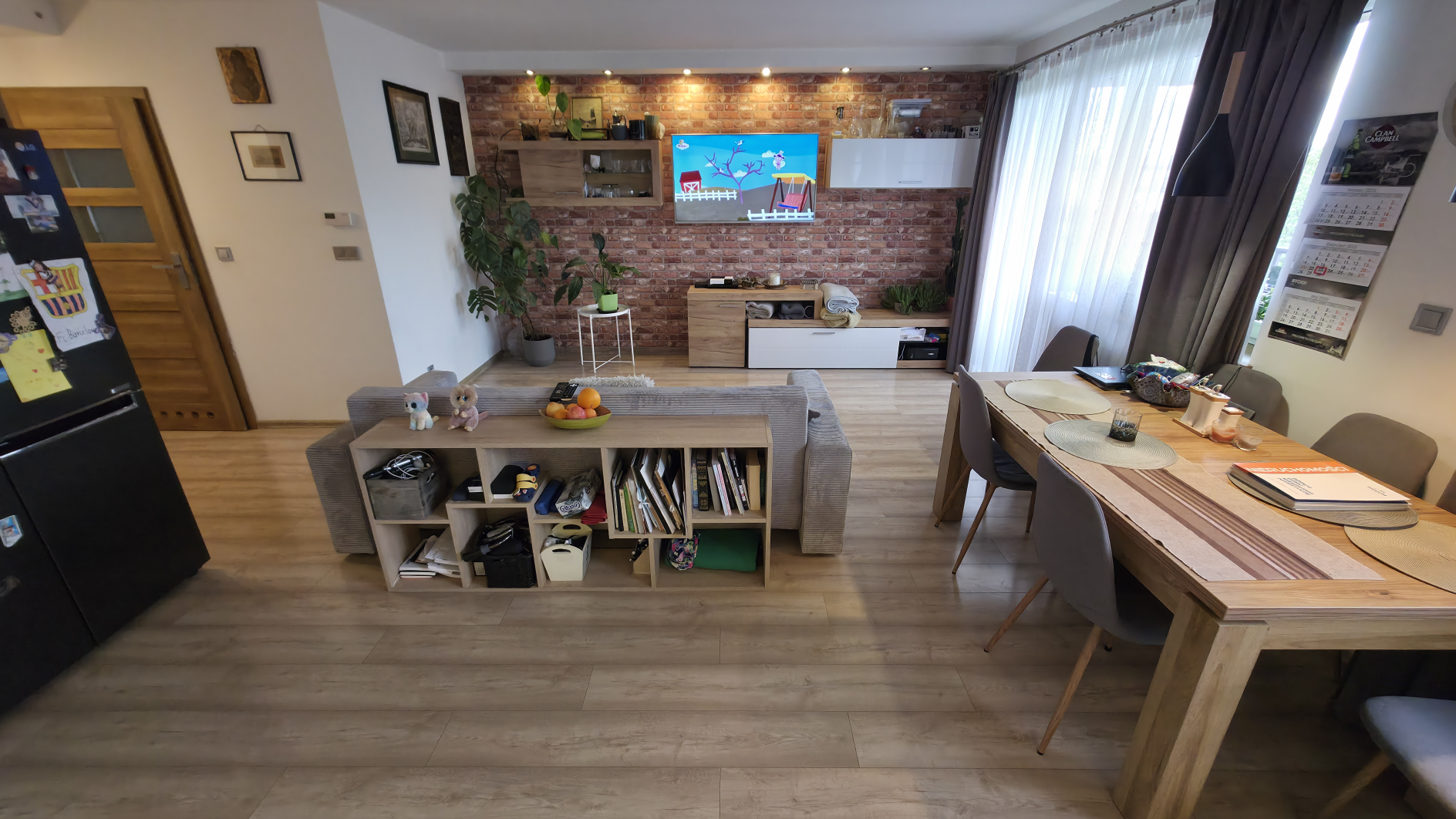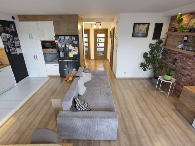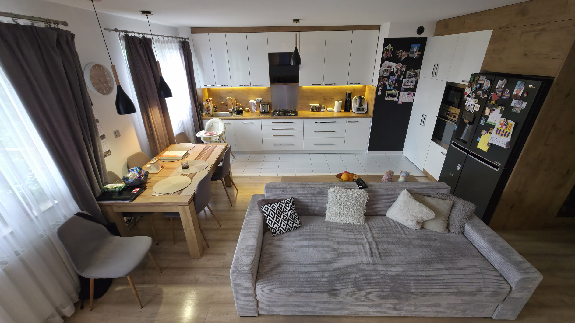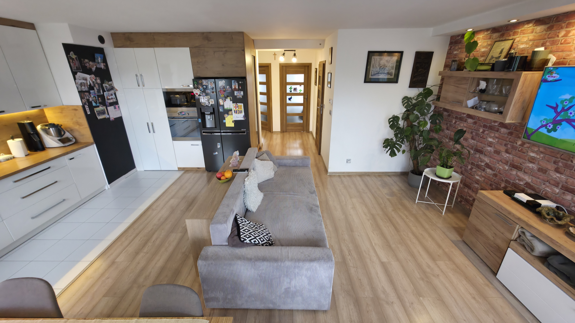 Mieszkanie o powierzchni 76.5 metrów kwadratowych. Zlokalizowane jest na drugim piętrze. Po przekroczeniu drzwi wejściowych znajdujemy się w przestrzennym przedpokoju. Po lewej stronie znajdują się dwa pokoje, na wprost łazienka, a kierując się na prawo, wchodzimy do dużej przestrzeni dziennej. Strefa zaprojektowana została jako dwie części tworzące spójną całość. Po lewej stronie znajduje się część będąca salonem z telewizorem i wygodną kanapą. W drugiej części znajduje się kuchnia w formie wygodnego aneksu oraz stół gdzie spożywane są wspólne posiłki.