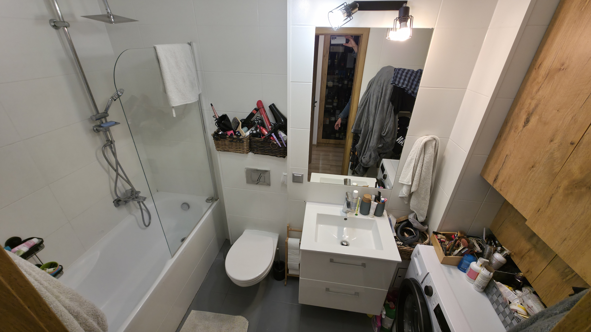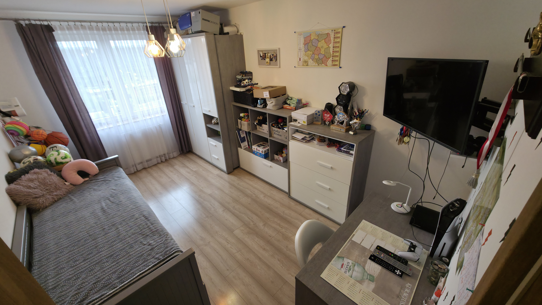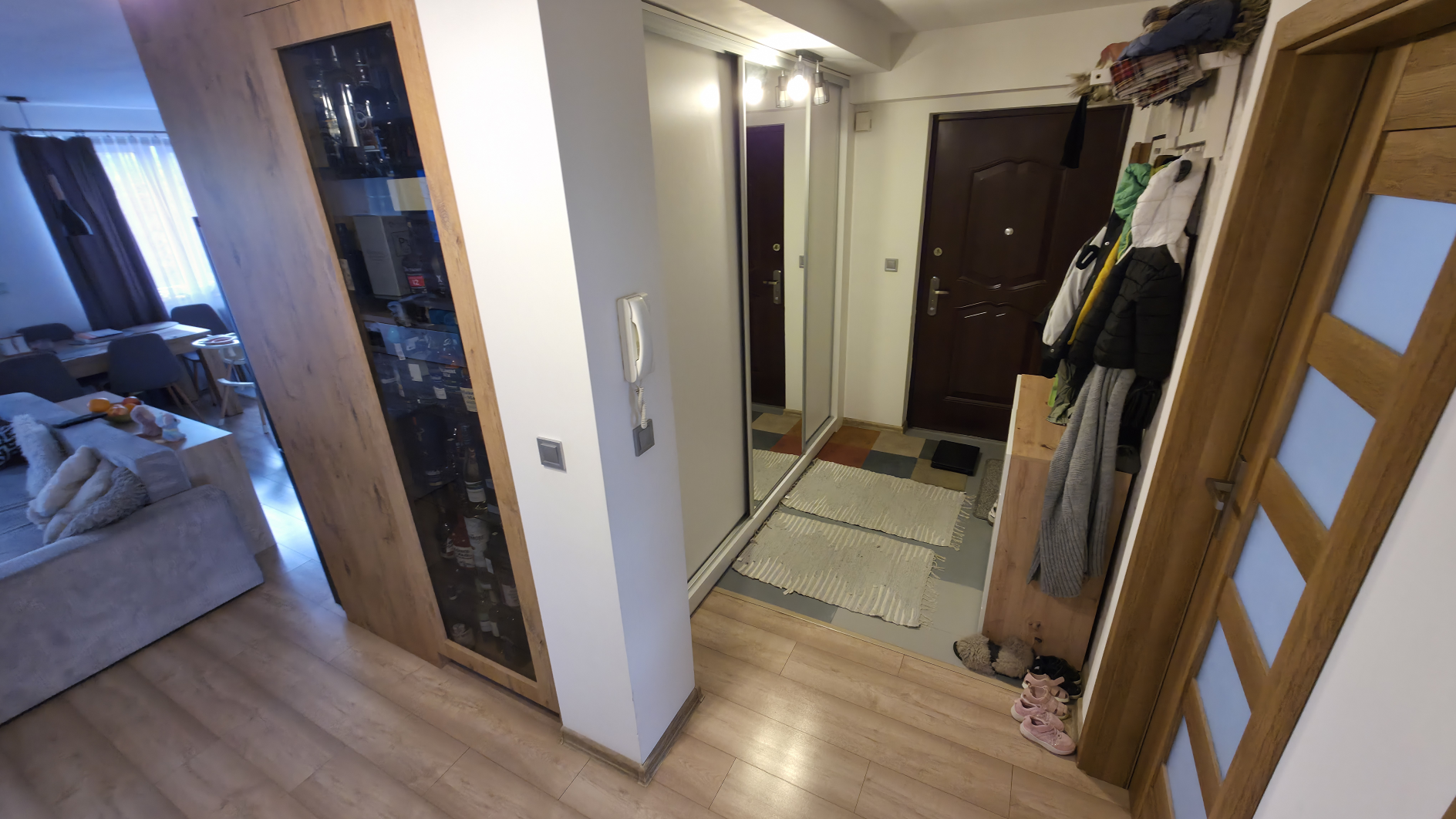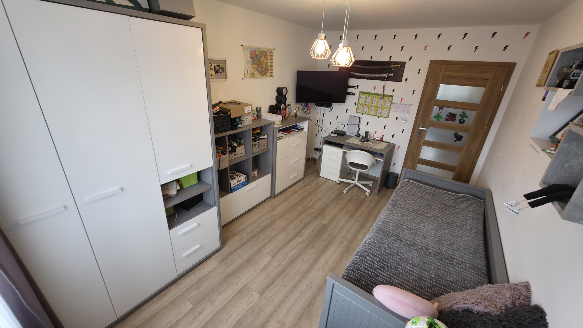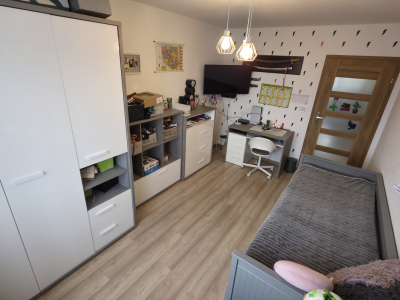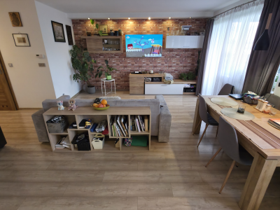 Mieszkanie o powierzchni 76.5 metrów kwadratowych. Zlokalizowane jest na drugim piętrze. Po przekroczeniu drzwi wejściowych znajdujemy się w przestrzennym przedpokoju. Po lewej stronie znajdują się dwa pokoje, na wprost łazienka, a kierując się na prawo, wchodzimy do dużej przestrzeni dziennej. Strefa zaprojektowana została jako dwie części tworzące spójną całość. Po lewej stronie znajduje się część będąca salonem z telewizorem i wygodną kanapą. W drugiej części znajduje się kuchnia w formie wygodnego aneksu oraz stół gdzie spożywane są wspólne posiłki.